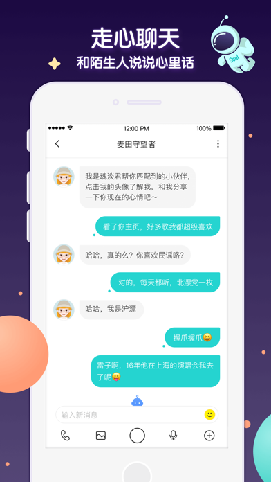 时下最in的弱关系社交,通过完成30秒的“灵魂测试”,来找到心灵相通的小伙伴。更有“Soul荐”算法,秒推最能懂你的陌生人,随时随地聊天分享~还可能找到Soulmate哦!!
