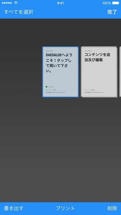 デジタルテキストとの出会いが、これほど自然に感じられたことはないでしょう。左右にスワイプするとページをぱらぱらとめくることができ、用紙の補充もドラッグ&ドロップするだけ。タップで開き、ピンチして閉じる。タップを繰り返すと、書き出したいシートを選ぶことができます。