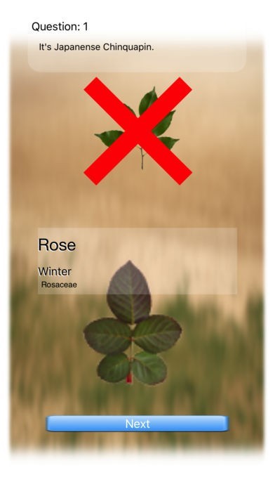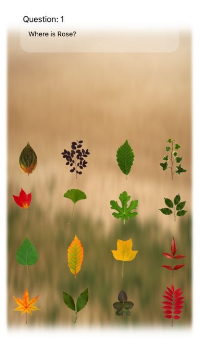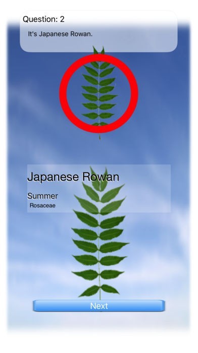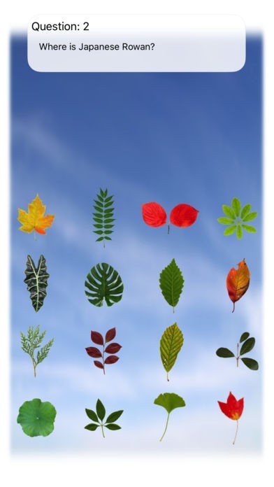 葉っぱを見て正しい正式名称を答えることができます。再現される葉は写真ではなく各特徴が見やすく描かれたグラフィックのため目立つポイントを意識して覚えることができます。