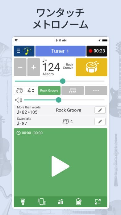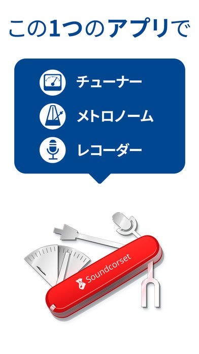 「チューナー & メトロノーム - Soundcorset」は、練習に必要不可欠なチューナーとメトロノーム以外にも沢山の機能を兼ね備えた、便利な多機能アプリです。 チューナー機能はマイクと連携して、楽器の音をそのまま周波数や音域で表示してくれます。音叉マークをタップすれば、音叉として使用する事も可能です。 メトロノーム機能には数々の機能が搭載されており、リズムキープ以外にもテンポ変更機能や、ライトや振動、画面の変化でリズムを教えてくれるテンポ表示機能、バッテリーセービング機能、演奏録音機能等、ただのメトロノームより格段に使い易い作りになっています。