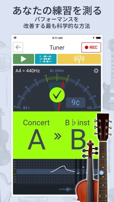 チューナーとメトロノーム両方搭載!マイク接続で生音を拾ってくれる!