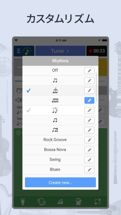 楽器の音が大きくても、ライトや振動、画面変化でリズムを表示!