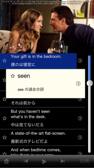 セリフと同じタイミングで対訳字幕が出てくるので分かりやすいです。知らない単語はタップすれば意味がその場で表示されるのでサクサク映画を見続けられます。
