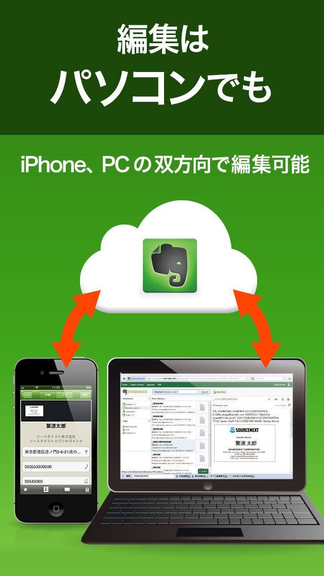 Evernoteを用いてスマホとパソコンの双方から名刺の管理ができるアプリです。名刺を毎日交換し合う方は名刺の数も増えて、管理するのが大変になります。このアプリはそんな負担を減らし端末で簡単に名刺管理することができます。使い方もカメラを使って名刺を撮影すれば文字認識機能により簡単に名刺の文字を読み取り登録してくれるので、面倒な入力作業をする必要はありません。名刺に記載された連絡先を直接スマホの連絡帳に登録することもでき、名刺を存分に活用することができます。パソコンとスマホの互換性を利用し、パソコンで細かい編集を行い、スマホで確認したい時にすぐに見るという使い方もできます。