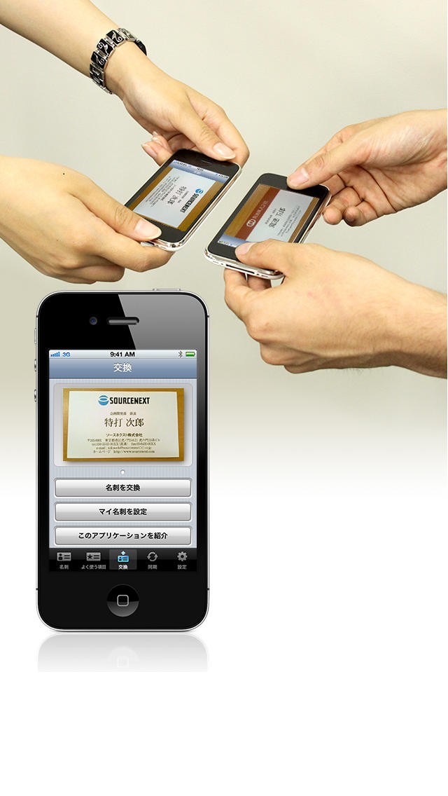 また、2台のiPhone上で名刺画像をお互いに差し出す動作をすることで、Bluetooth通信で名刺データを交換することができます。