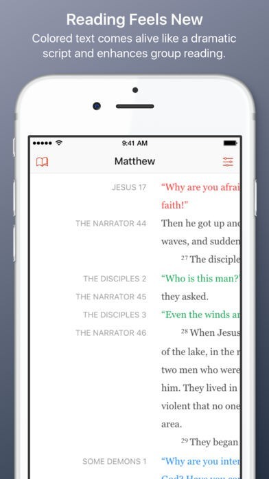 • Four different colors of Biblical text reads dramatically like a script. Color defines source role per book: