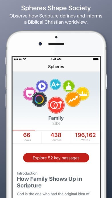 Society is shaped by seven spheres of influence. With the Spheres in-app purchase unlocked, you'll be able to make personal observations about how scripture can be used to shape a Biblical Christian worldview.