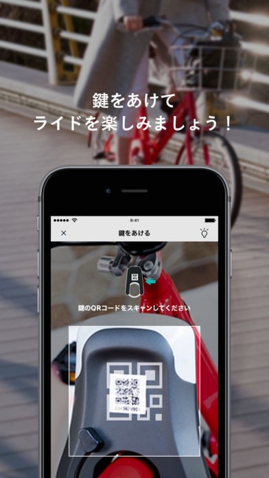 「メルチャリ」の初ログイン時には、カンタンなチュートリアルが表示されます。読み取るQRコードの場所などを写真つきで教えてくれるため、シェアサイクルを利用したことがない方でもスムーズに使うことができます。