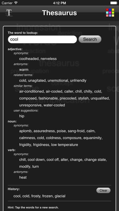 App Storeより引用Retrieve the synonym for every word. If available you will get antonyms, related terms, similar word and user suggestions too. Tap one of the results to start a quick new search for that term. It keeps a history list of your search terms as well.