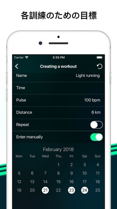 ・時間、距離、速度、消費されたカロリー、心拍数というパラメターを記録します。