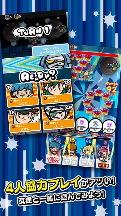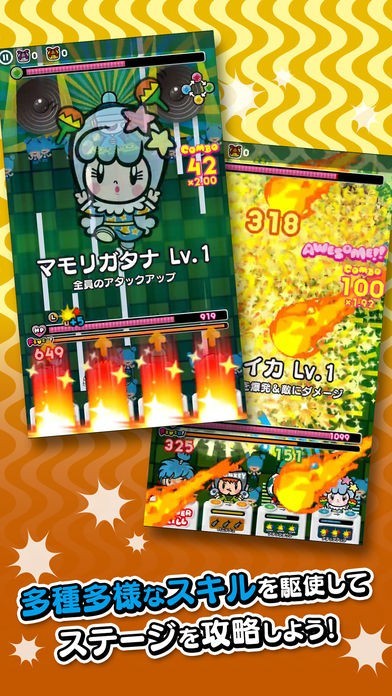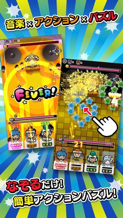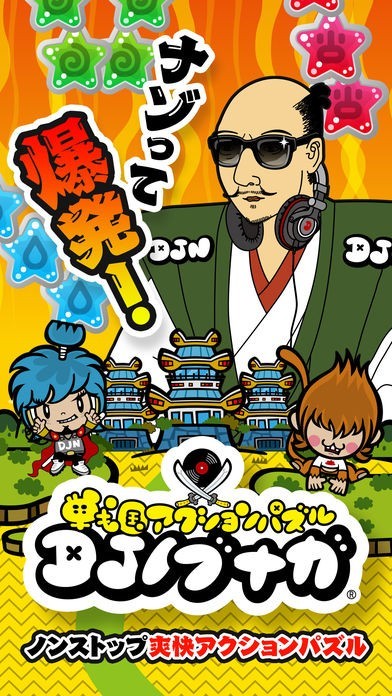 アプリ「戦国アクションパズル DJノブナガ」では、日本を代表する超人気DJ「中田ヤスタカ」さんがプロデュースしたポップな楽曲に合わせて、流れてくる星型のピースをなぞって爆発させることによって、敵のキャラクターを攻撃して先に進んでいく、直感的な操作感が魅力のアクションパズルゲームを楽しむことができます。