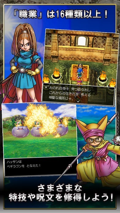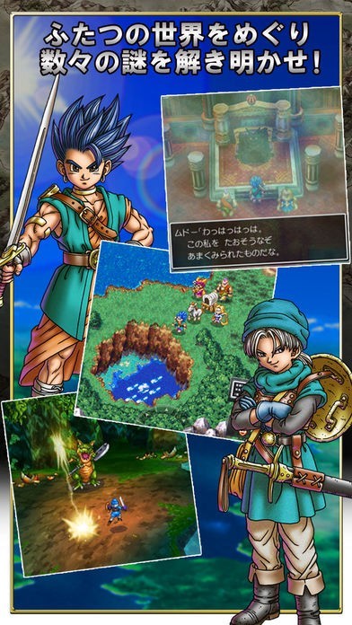 ドラゴンクエストVI 幻の大地はスーパーファミコンソフトで最初に発売されたロールプレイングゲームアプリで、後にグレードアップされて発売されたニンテンドーDS版をもとに作られたスマートフォン版アプリです。熟練度を導入して新しくなった転職システムやオリジナル版と違いスライムのみ仲間にできるシステムへの変化が見どころです。