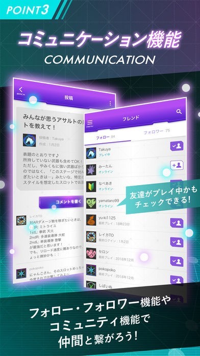 コミュニティに所属することができ、専用のスレッドでコミュニケーションを行えます。お互いにフォローし合えばプレイ情報を共有出来る。より良いスコアを目指しながら、切磋琢磨しましょう。