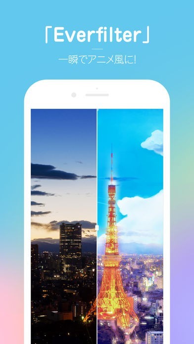 「SNSを使ってはいるけれど、ただの写真を投稿するだけじゃ物足りない」 「人と違った、もっと面白い写真を発信したい!」 そのような人にオススメなアプリが「Everfilter」。 保存してある写真の中から加工したいものを選ぶだけで、普段目にするありふれた風景を、まるでアニメの背景のような美麗グラフィックへと変身させる事ができます。 さわやかで美しい色使いになるので、いろんな場所の写真を撮るのが楽しくなる事でしょう。 また、日中に撮影した写真を夜景に加工できる機能もあります。