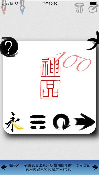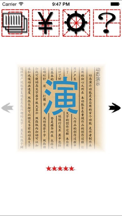 線で形づくられた筆文字の中をなぞることで、文字の中での力の入れや抜きを習得できます。一画ごとに実際に空白部分に触れて漢字を書くことができ、きれいな筆文字の癖を繰り返し会得できます。