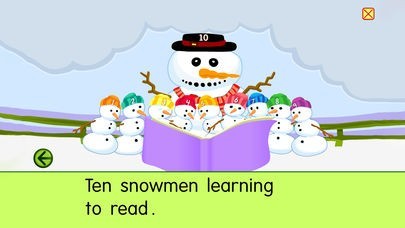 App Storeより引用Children love making snowmen and listening to the charming “Ten Little Snowmen” song. Learn to count to ten and read essential vocabulary while you play. Practice has never been more fun! In this App edition, create a snowman gallery and match number sets to number symbols, and colors to color words.
