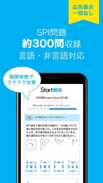 SPI試験対策から面接、就職サイトへのエントリーまでiPhoneを使って気軽に行うことが出来る就職活動準備アプリが「SPI問題・面接対策-Start就活」です。SPI試験対策問題が言語、非言語を合わせて100問収録されているのでちょっとした空き時間を使ってSPI試験対策を進めることが出来るようになっているだけでなく、就活力診断機能では対策企業別に面接を受けたときの成功率を診断してもらうことも可能となっています。