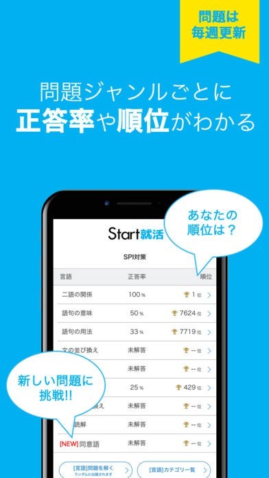 SPI試験問題が言語型問題、非言語型問題併せて100問収録されていてタップなど簡単な操作だけで問題に解答することが出来るようになっているので、通学中や休憩中などにSPI試験対策を進めることが出来るようになっていて、貴重な時間を効率的に使うことが可能となるだけでなく、随時新しい問題も追加されていきます。