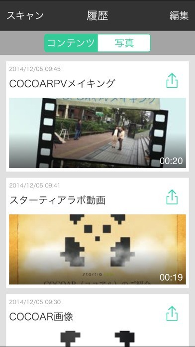 「COCOAR」では、画像をスマートフォンのカメラで読み込むことによって、アプリ内の様々なデータを利用することが出来るようになります。 それらは履歴の「コンテンツ」から閲覧することが出来るようになっていて、タップすれば動画であれば再生することができます。 そして下部には詳細な説明が書かれておりその下には、「共有する」というボタンがあって、そこをタップすることによって、他の方に見てもらったりすることもできるので、とりあえず使ってみるのもいいでしょう。