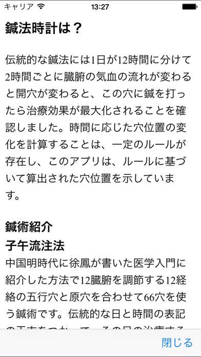 時間鍼術では時間帯によって、鍼を打つ効果的な場所が変わってきます。打つ場所を探すのは難しいのですが、アプリの画面で教えてくれます。本で読んでみたけど難しくて分からないときアプリで調べてみましょう。