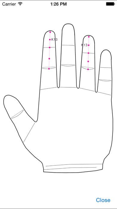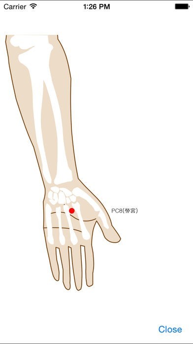 文章だけではなかなか伝わらないときもあるでしょう。そんなときはアプリ搭載の身体図を見ます。鍼を打つ場所が赤く印付けされているので、一目見れば打つ場所が分かります。