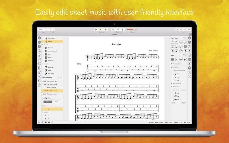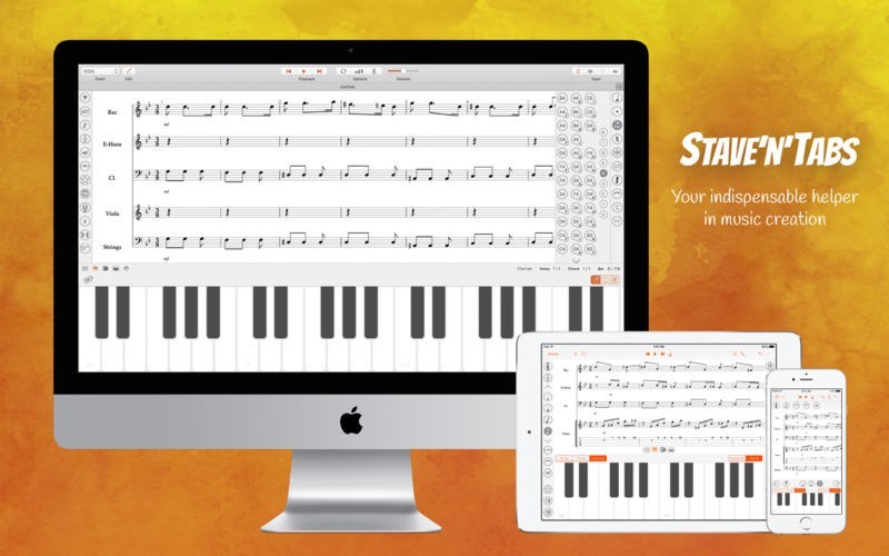 App Storeより引用The well-known iPad, iPhone and iPod Touch notation and tab editor Stave’n’Tabs is now available on your Mac. Simple interface, fast files’ opening, smart and convenient tools let you feel the atmosphere of the majestic classical scores, dynamic rock ballads or good old jazz. Support of the main musical formats such as MIDI and MusicXML allows you to easily listen and practice your songs and compositions created earlier.