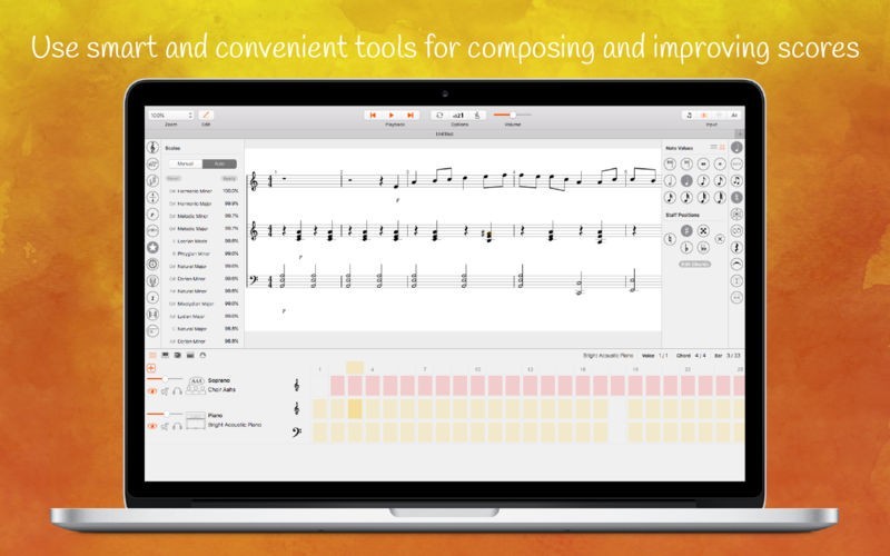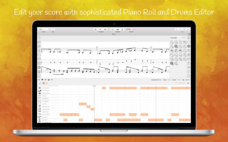 • Explore and edit your score with sophisticated Piano Roll and Drums Editor