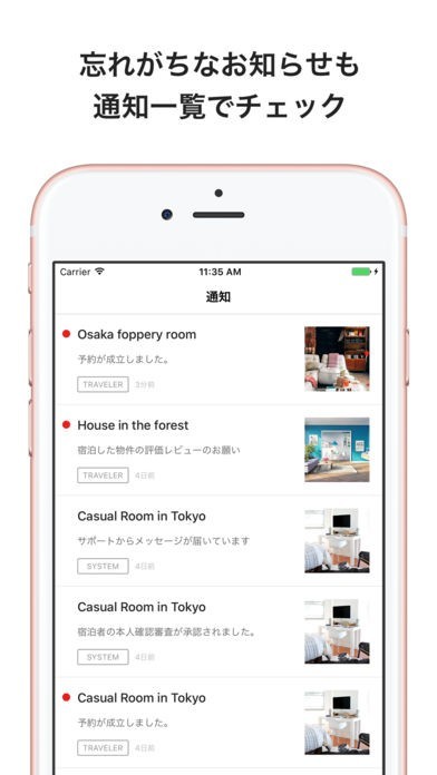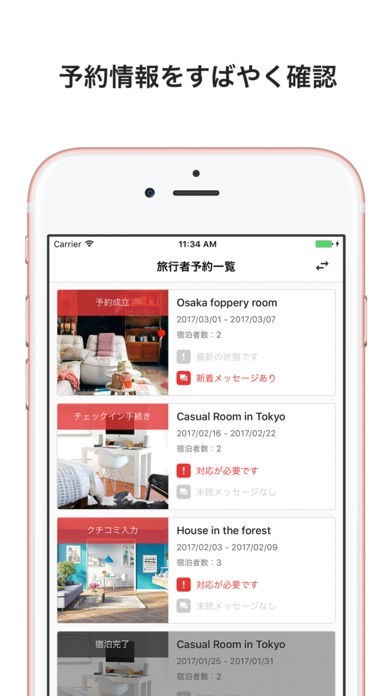 予約ステータスの変更状況や、旅行者からの新着メッセージなどの通知に素早くアクセスできます