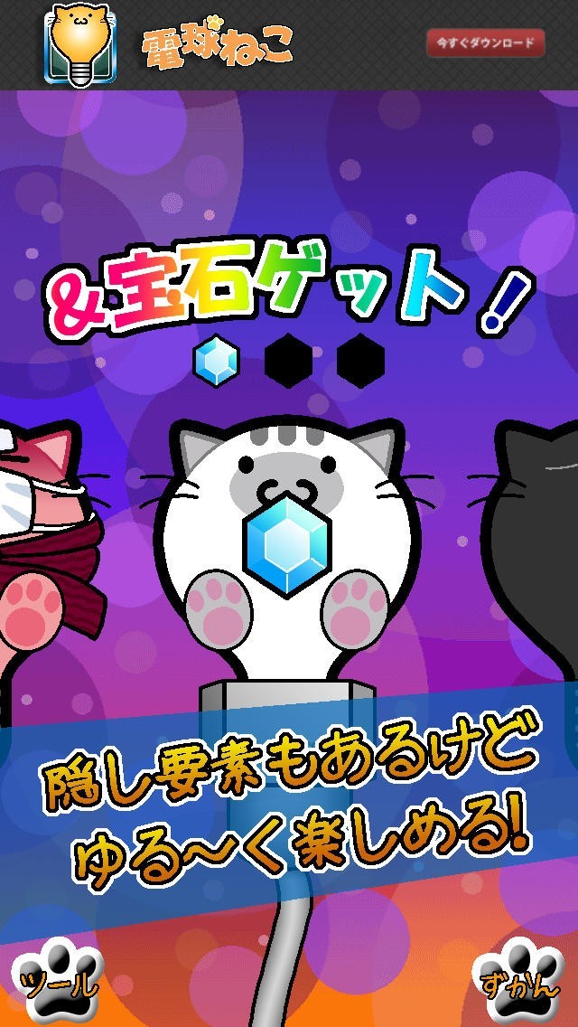「電球ねこ」は、充電するたびに楽しさが増えるアプリです。 アプリを起動して充電すると、ゆるくて可愛い電球型のねこ「電球ねこ」が誕生します。 図鑑機能も搭載され、誕生した電球ねこを図鑑としてコレクション。 ねこの種類はなんと269種類! コレクション好きや猫好きにはたまらない、ゆる〜く、長〜く楽しめるアプリです。 誕生した電球ねこたちは眺めるだけではなく、耳や足をなでなですると動きます。 さらに、癒されるだけではなく、電気情報も教えてくれる優れもの。 iPhoneの残量、待ち受け、通話、音楽を使った時の時間を数値化して教えてくれるので、外出中の目安になる便利な機能です。 iPhoneを使うすべての人に、眺めて、触って、教えてくれる、ただの充電が楽しめる充電へと変わります。