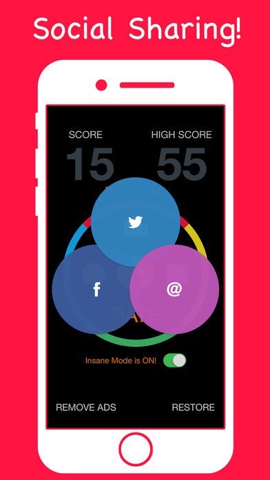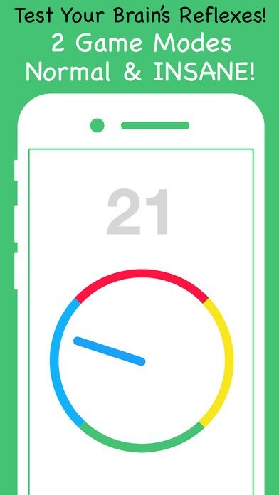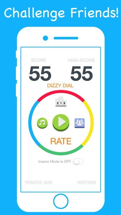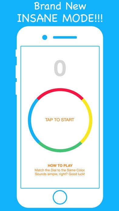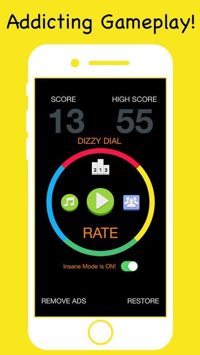 The Dizzy Dial of color revolves around the color wheel and the only way to stop it is by tapping when it's pointing to the same color. Tap wrong and it's game over. It looks simple but the dials spins faster and faster as you score more points, turning into a bewildering test of your reflexes, mental skills, and coordination.