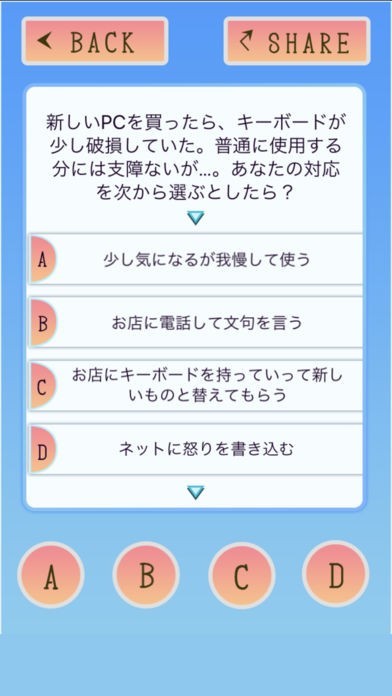 質問には選択肢が4つ用意されていて、その中から選ぶだけなので非常に簡単です。ストレスに関する質問に全部答えると、最後にあなたのストレス耐性について診断結果が表示されます。
