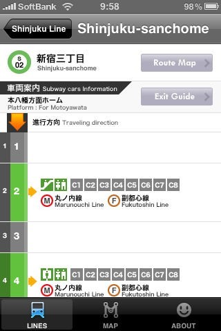 Japan Subway Route Mapは、日本の地下鉄(東京メトロ、都営地下鉄、大阪市営地下鉄、名古屋市営地下鉄)の路線リスト及び路線図を手軽に見ることのできるアプリケーションです。