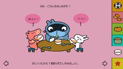 かわいらしいキャラクターの挙動にあわせて、画面上をタッチすることで、ストーリーを進めることができます。簡単な操作でお子さんが楽しめ、また読みの練習など学習にもつながること間違いなしです。