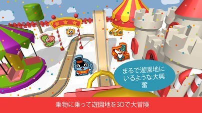 あなたのおかげで、パンゴは友達と一緒に乗物に乗ったり、そりで遊んだり、観覧車やメリーゴーランドを次々に楽しめるみたい。
