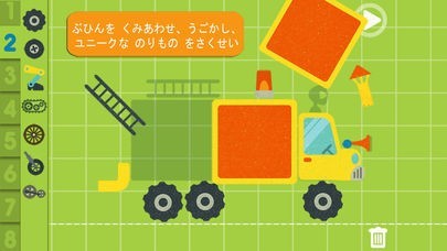 完成した車のリストの中から、しょうぼう車や、ヘリコプターや、ロボットや、せんすいかんなど、きみの好きな乗りものを選んで、きみの夢の車を作ることもできるよ。