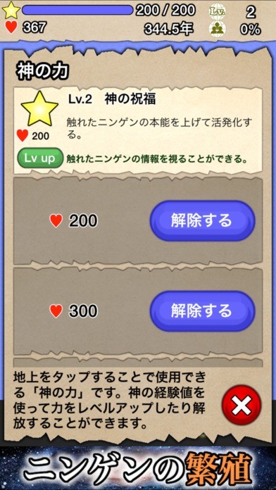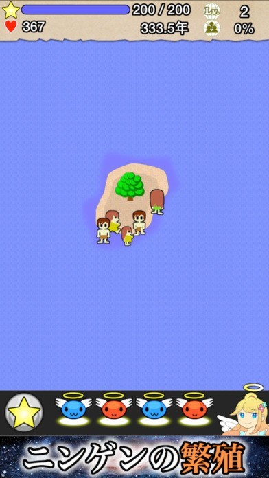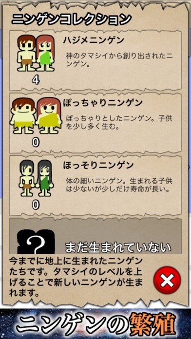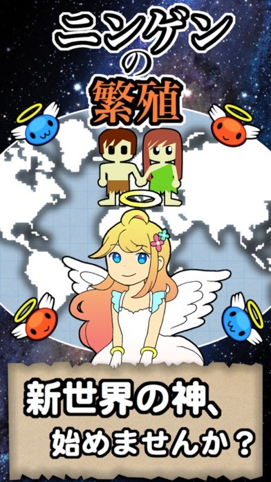 ニンゲンの繁殖は、新世界の神となって人間を創造していきます。タマシイをタップすると人間が生まれます。男性は青いタマシイ、女性は赤いタマシイです。人間は、繁殖して寿命が来るとタマシイに戻ります。神が人間の本能を刺激して、たくさん子供を増やしていきます。空の上から見守っている感覚で遊べます。繰り返していくと、人間のレベルが上がったり、種類が増えてきます。自分自身が世界を作り上げていくようで、寛大な気持ちになれます。創造の世界が膨らんでいきます。