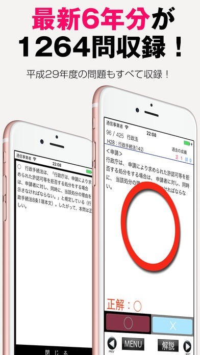 過去6年分、最新全1264問が搭載されています。6年分の参考書を持ち歩くととても重く場所をとりますが、アプリを使えばスマホの中で管理でき、いつでもどこでも勉強することができます。