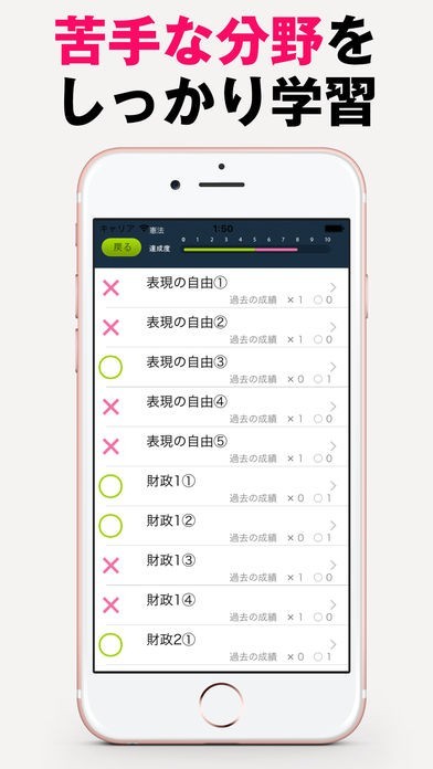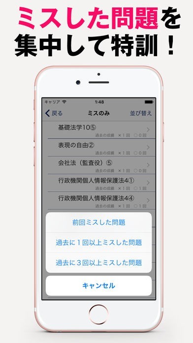 ランダムで出題出来るため、本番を意識してテストや演習を行っていきたい方にも役立ちます。チェックリスト機能が用意されているので、ミスした問題も素早く把握出来ますね。