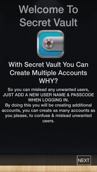 App Storeより引用With Secret Vault you can have MULTIPLE ACCOUNTS, this helps mislead unwanted prying eyes. Simply create a different username & password when you first log into Secret Vault, this will create an additional account, it's as simple as that!