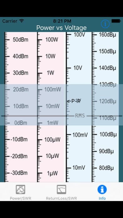 Info タブは電力と電圧を dBm/W/Volt/dBµ の4つの相関がわかるスケールを表示します。