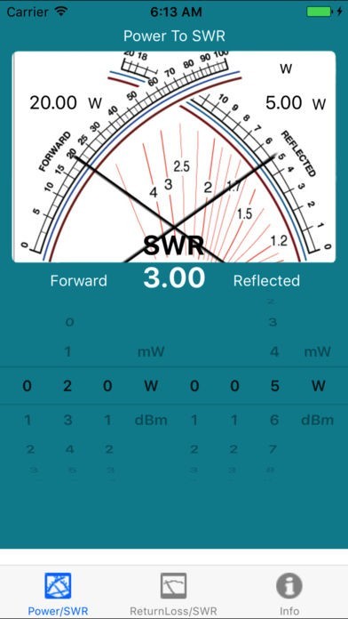 SWR は高周波電力を効率よく伝達するためのマッチングを測定する手段ですが、この進行波( FWD)と反射波(REF)との比で表示する測定器が SWR メーターです。本アプリはアナログSWRメーターをシュミレーションしてクリックホイールで進行波、反射波をセットするだけでメーターがアナログ的に振れ、SWR値が表示されます。