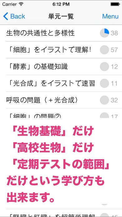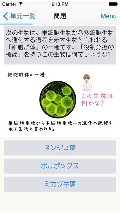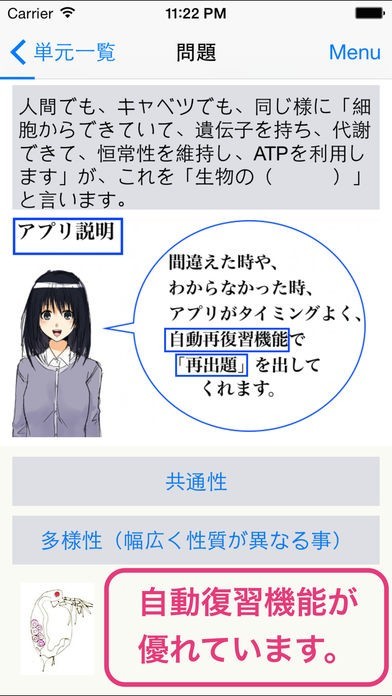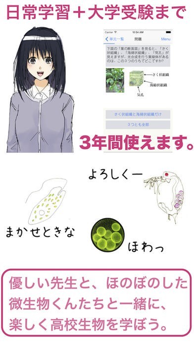 このアプリは、スマホで手軽に生物の勉強をすることが出来ます。 高校になると勉強もさらに難しくなり、なかなかついていけなくなってしまうこともあるのではないでしょうか。 そんな時は、スマホを使って効率よく勉強をしましょう。 机に向かってはなかなか出来ない勉強も、スマホを使うといつでもどこでも勉強出来て便利です。 単元ごとの勉強が出来るので好きな範囲だけを選んで学べますし、学校の勉強に合わせて予習・復習をすることも出来ます。 漫画調の問題や解説がついているので、楽しく勉強が進むアプリです。