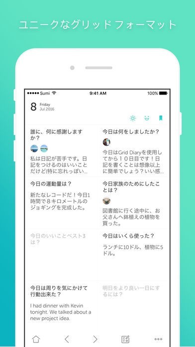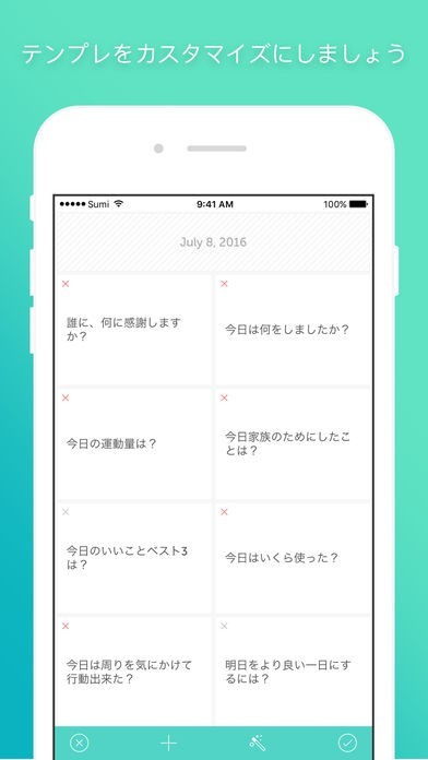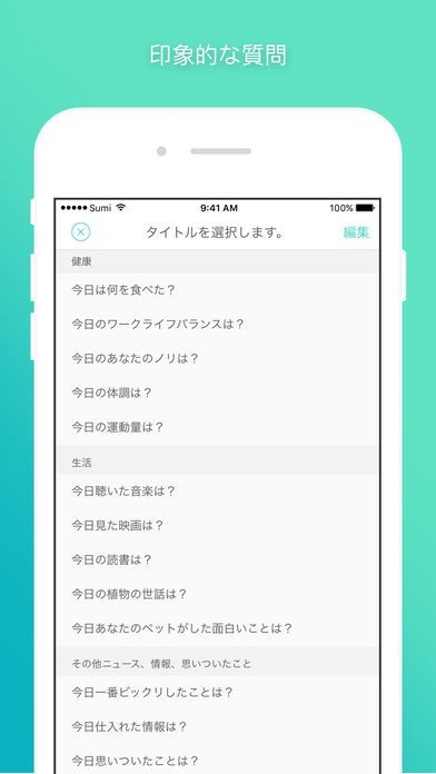 8つの質問を選んで設定しておけば、その質問に答えるだけで書く内容を悩まずに日記を書くことができます。質問は編集することも可能なので自分の好きな質問に変更することもできます。