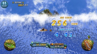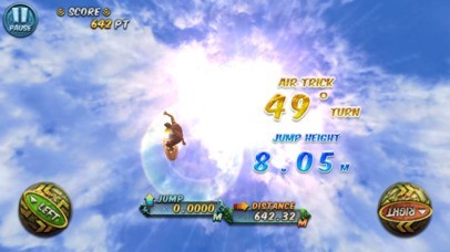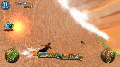 波に乗るときは下向きの姿勢を維持してスピードを出して、MAXスピードでジャンプしましょう。着水角度も上手くコントロールしてください。障害物にぶつかるとスピードは落ちますが無理に避ける必要はありません。