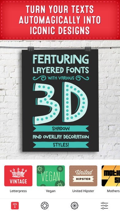 アプリ内には、3D、影、マルチカラーレイヤー・フォントなどの文字編集機能が搭載されているので、無数の組み合わせの中から自分の好みのタポグラフィを作成することができます。
