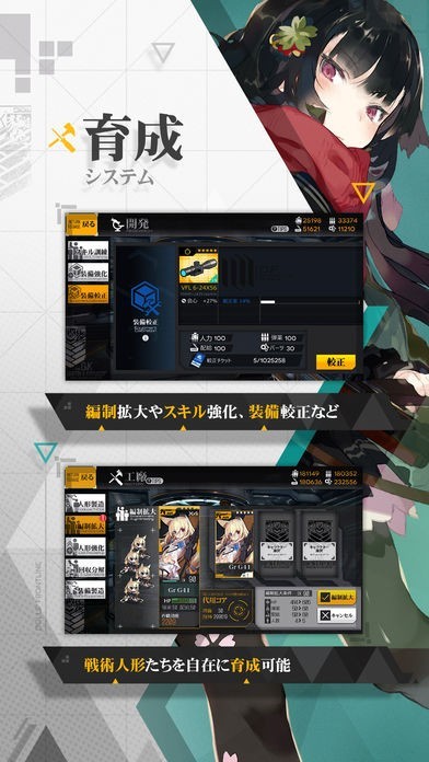 プレイヤーが操るドールたちを自由に育成することができるようになっていて、編成の拡大やスキルの強化、装備の変更などによって思い通りのドールへ育てることができます。