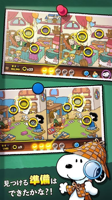 このパズルアプリは、人気キャラクターのスヌーピーがまちがい探しで登場。出題されたイラストから制限時間内にすべての間違いを見つけられるか、ステージクリアでアイテムゲット。