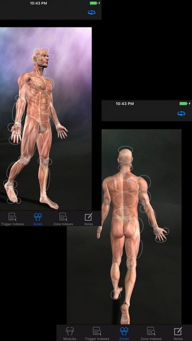 App Storeより引用A reference for trigger points and referral patterns for 108 muscles. Features 160 trigger points with their corresponding referral patterns, 80 conditions that can be caused by trigger points, and 25 videos that show how to release specific muscles. Each muscle includes the visual referral pattern and point location, plus a written muscle action, referral, origin, insertion, nerve, comments, and audio pronunciation for each muscle. You can choose to view each muscle individually, or use the zones view to see all the muscles that refer into a specific area (or for a specific condition). This is a great help in discovering the source of pain.