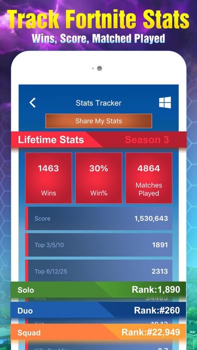 Track stats and ranking for any player of Fortnite Battle Royale for all platforms. (PC, XBOX, PS4) Up-to-date stats include lifetime, solo, duo and squad. Share your stats with all your friends and teammates to let them know how to track their own on mobile devices!