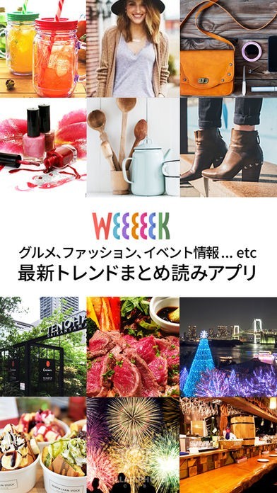 App Storeより引用Weeeeek(ウィーク)は、話題のスポットや最新イベント情報・グルメ・ファッションなどいま人気の情報をあつめた無料のトレンド&ライフスタイルマガジンです。毎日毎週が楽しくなるトレンド情報がギュッと詰まっています。